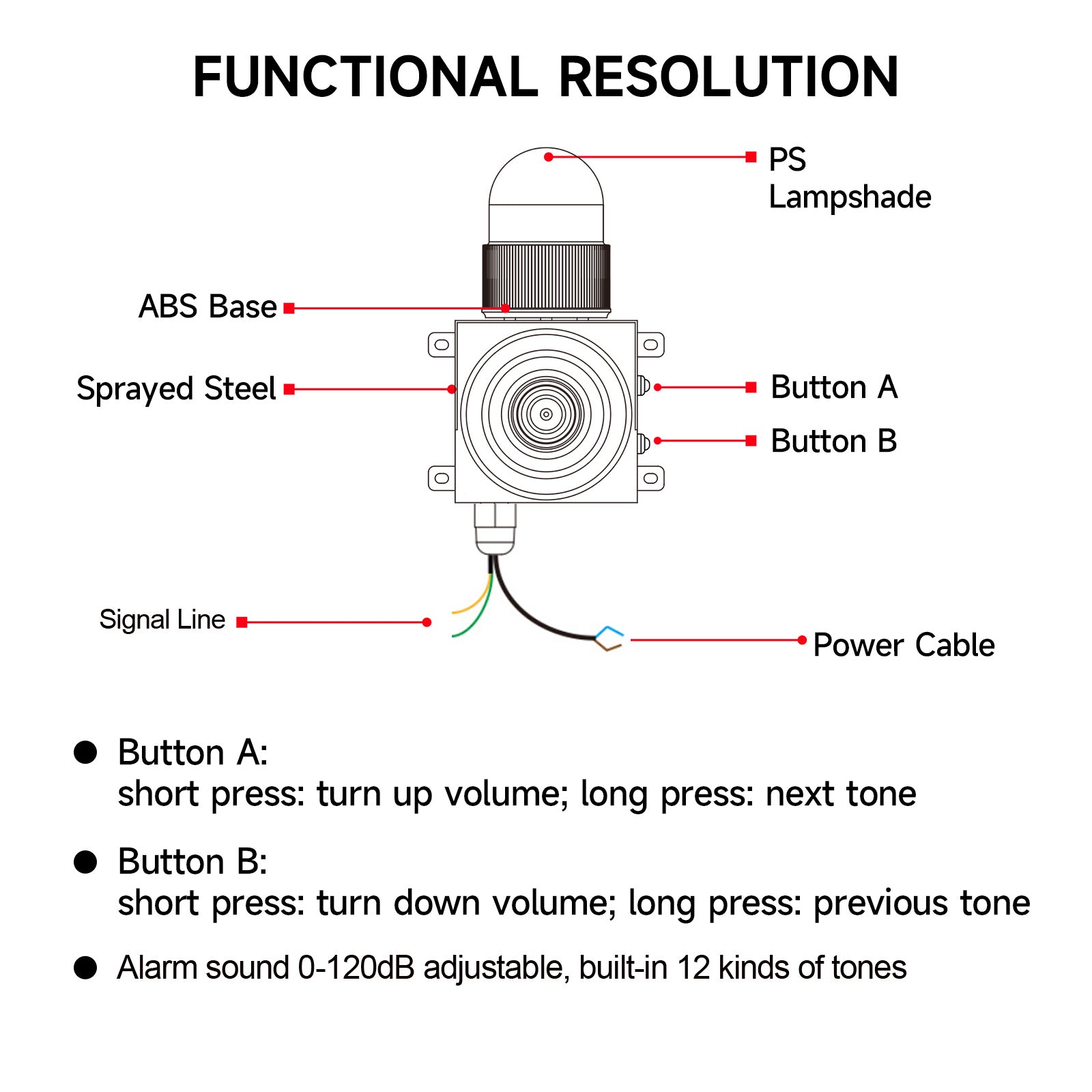 Alarm features: 120 decibels alarm tone, alarm volume can be adjusted by the alarm side button! Alarm built-in 9 tone, you can switch to different tones through the button! You can upload your own sound through the USB port on the alarm! The alarm light uses LED beads, high brightness, low power consumption and long service life! The alarm adopts waterproof and dustproof material, the protection level can reach IP65, indoor and outdoor can be used.
