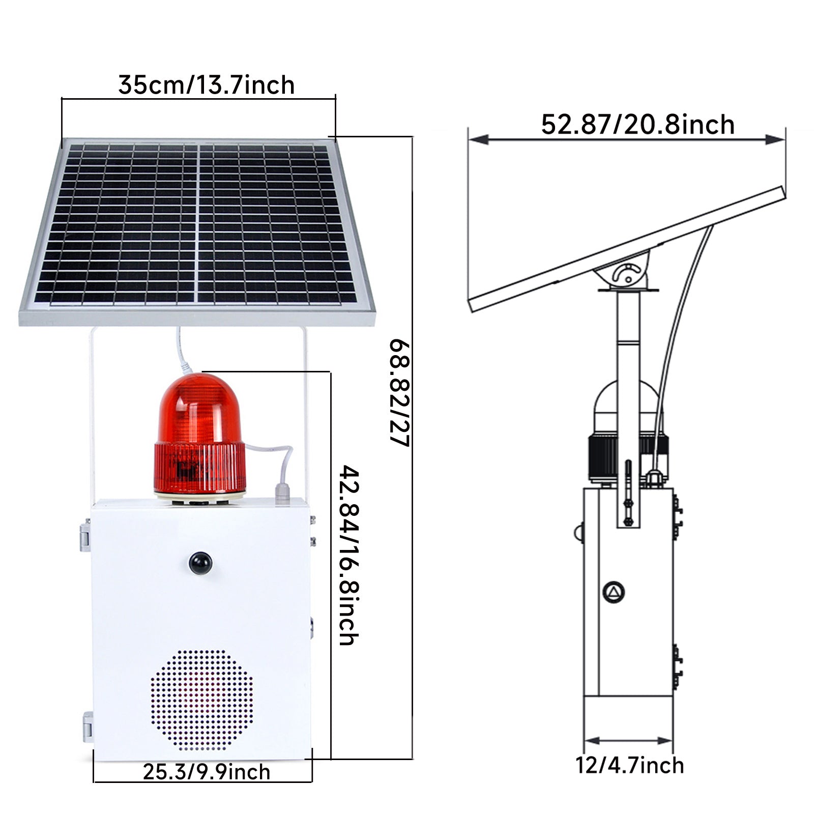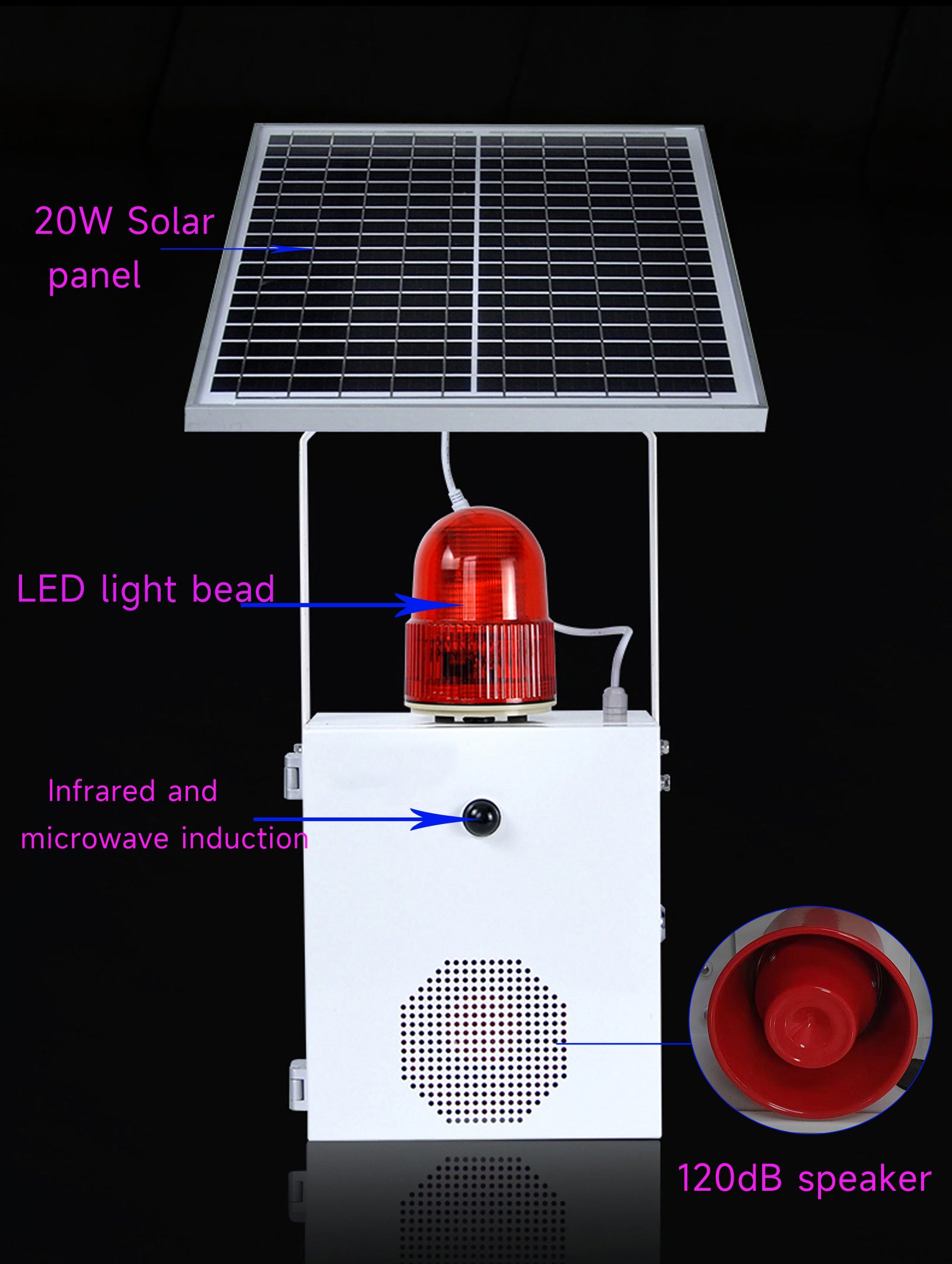 【Motion sensor alarm overview】The alarm is equipped with 20 watt solar panel and 10000mAh battery power, suitable for outdoor without wiring. Sensor detects movement of people/vehicles automatically alarm. The solar panel is installed facing the sun. It can be used for a long time under special circumstances such as rainy environment and night. Open the internal power switch before use
