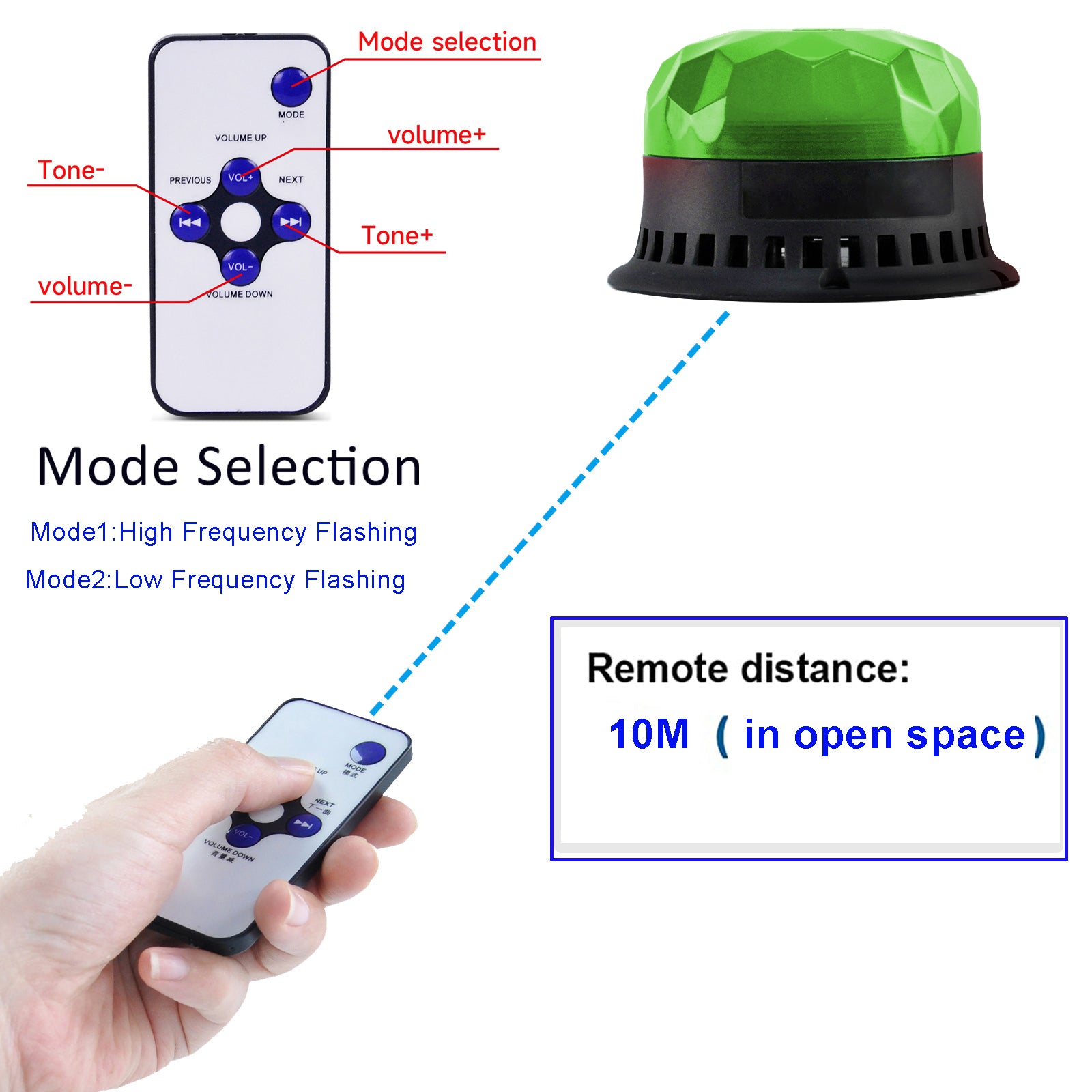 【Adjust volume tone】The car strobe light volume up to 120dB, built-in 9 alarm tones. The tone volume can be adjusted by the remote controller, and the custom audio can be upload through the Micro USB port