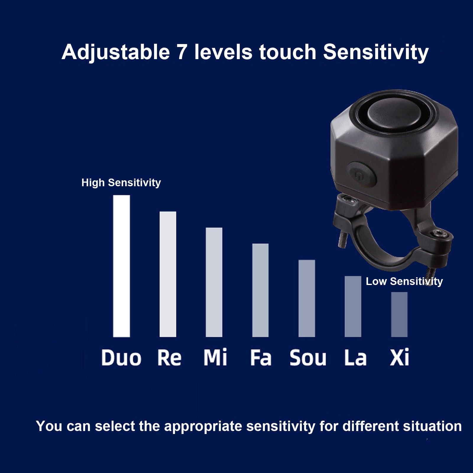 - This anti theft alarm triggered by vibration, with 110dB loud alarm sound can help to deter thieves effectively, provide additional security! 3 adjustable volumes up to 110dB. There are 7 levels of adjustable sensitivity from gentle touch to push or beat.