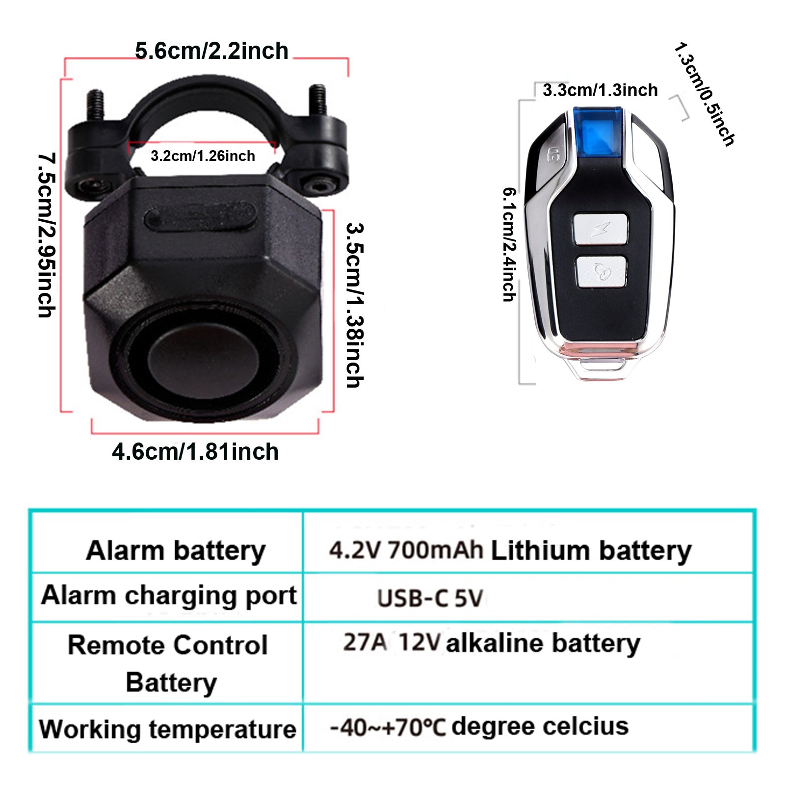 - Battery of alarm: 4.2V 700mAH Lithium battery